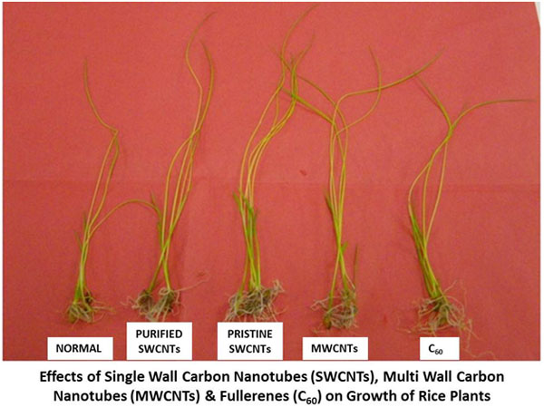 Effect of carbon nanomaterials on the germination and growth of rice plants. Remya Nair, M. Sheikh Mohamed, Wei Gao, T. Maekawa, Y. Yoshida, P. M. Ajayan, D. S. Kumar, Journal of Nanoscience and Nanotechnology (2012) 12(3):2212-20.