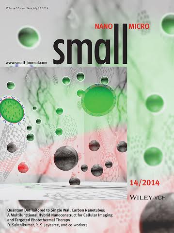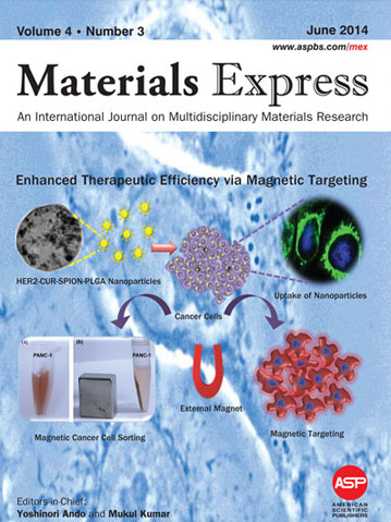 | Cover page article: Augmented cellular uptake and antiproliferation against pancreatic cancer cells induced by targeted curcumin and SPION encapsulated PLGA nanoformulation Materials Express 4 (3) (2014) 183-195 | Back cover page article: Quantum Dot tailored to single wall carbon nanotubes: A multifunctional hybrid nanoconstruct for cellular imaging and targeted photothermal therapy, Small 10 (14) (2014) 2964 | |